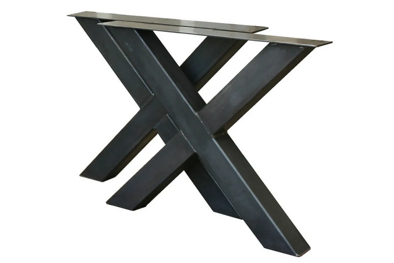 Das Produkt ist ein modernes Tischuntergestell aus Metall in X-Form mit sichtbaren Schweissnähten im Industrial Style. Der Tischfuß aus Stahl hat die Maße Breite 83cm, Höhe 72cm und Tiefe 13-90cm.