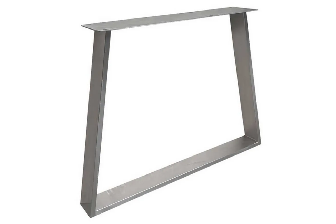 Der trapezförmige Fuß für Tischplatten aus Voll- oder Massivholz ist aus Edelstahl und hat eine Breite von 95cm, eine Höhe von 72cm sowie eine Tiefe von 17cm.