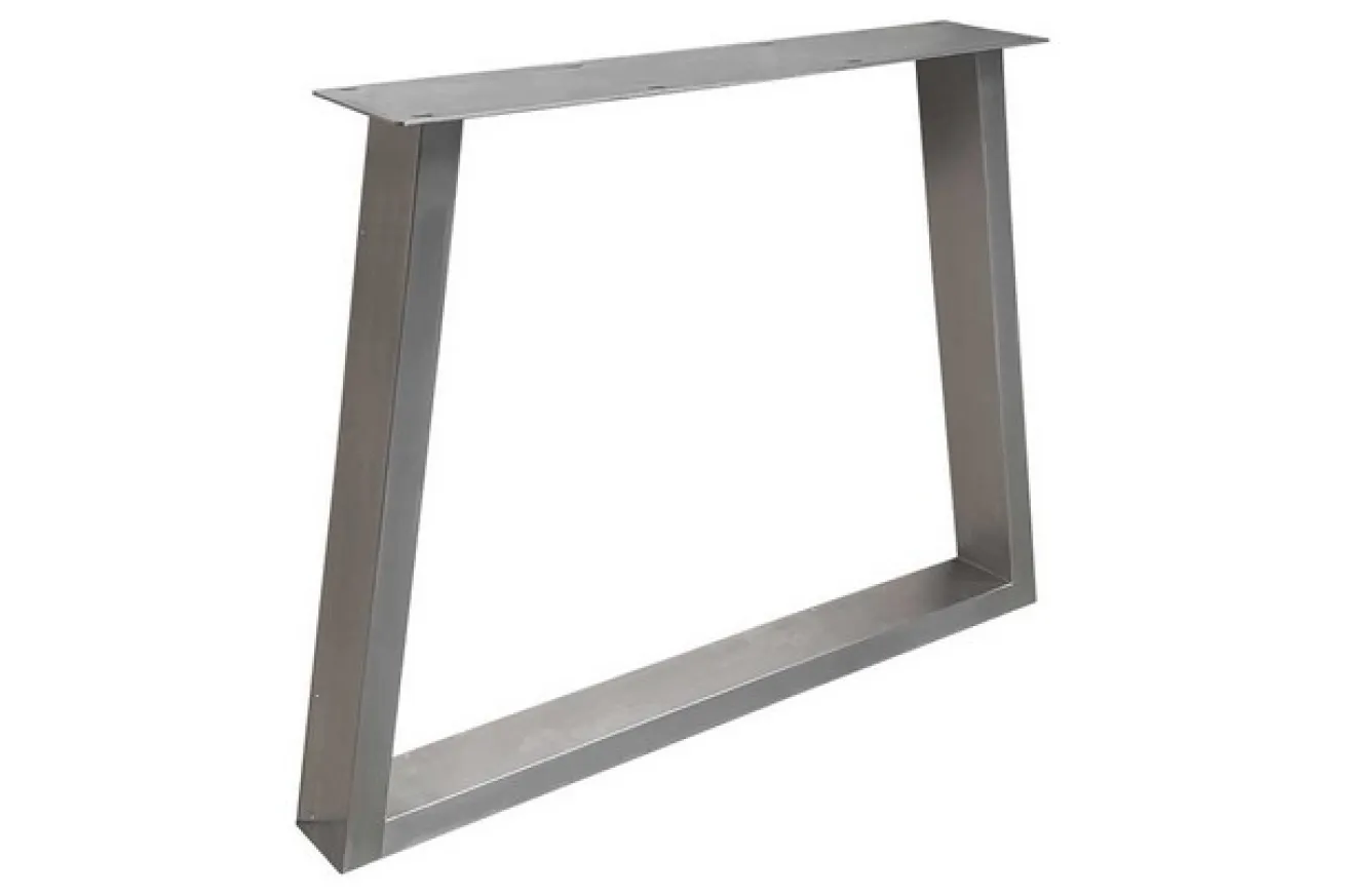Der glänzende Fuß für Tischplatten aus Holz ist aus Edelstahl. Mit einer Breite von 95cm, einer Höhe von 72cm und einer Tiefe von 10cm erinnert der trapezförmige Fuß unter Anderem auch an ein Bügeleisen.