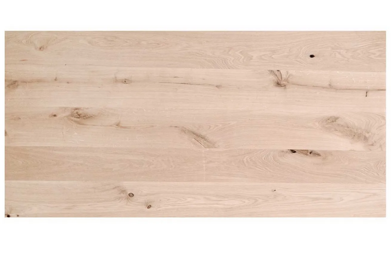 Diese wunderschöne Tischplatte aus Massivholz wurde aus massiver europäischer Eiche gefertigt, die am häufigsten vorkommende Baum- und Holzart in Deutschland. Die Platte besteht aus fünf Holzbohlen, welche zusammengepresst wurden, um die unterschiedlichen Maserungen zu einer unikaten Tischplatte zu machen. Diese Planken variieren in ihrer Breite zwischen 8-18cm. Die natürliche Farbe steht im Kontrast zu den dunkleren Astlöchern und Maserungen, die zum naturbelassenen Erscheinungsbild der Platte gehören. Die Tischplatte hat eine Breite von 160cm, eine Tiefe von 80cm und eine Höhe von 4,5cm. Diese erschließt sich aus einer aufgedoppelten Tischplatte, was bedeutet, dass jede von ihnen 2,25cm dick beziehungsweise hoch ist. Die rechteckige Tischform hat auf der Rückseite Entlastungsrillen und die Lamellen werden mit einem Stahlprofil fixiert, was das Verziehen der einzelnen Planken verhindert.