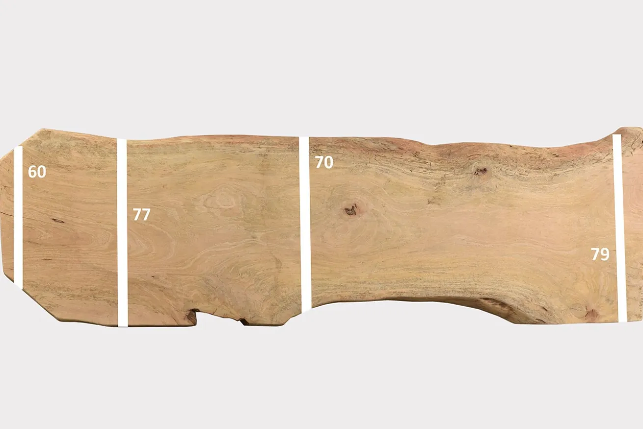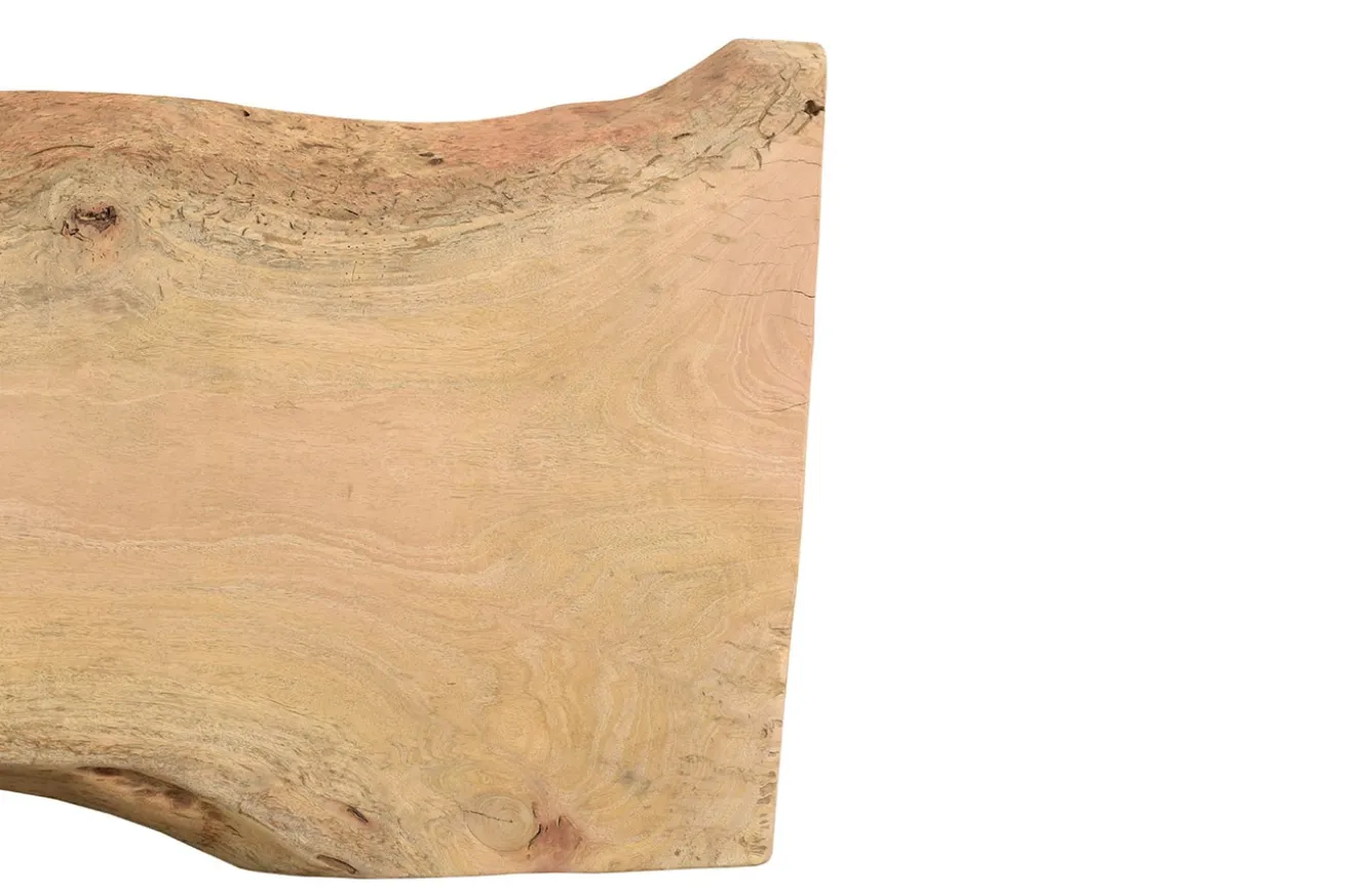 Das Holz des Mangobaums wird in große Stücke gesägt und getrocknet, um schließlich zu Kommoden, Truhen oder Tischen verarbeitet zu werden. Das sehen Sie auch hier an unserer angebotenen Platte aus Mangoholz. Sie hat eine unbehandelte Oberfläche, so dass ihre außergewöhnlich helle Farbe mit warmer Note und ihrer organischen Form ein elegantes Aussehen darstellt.