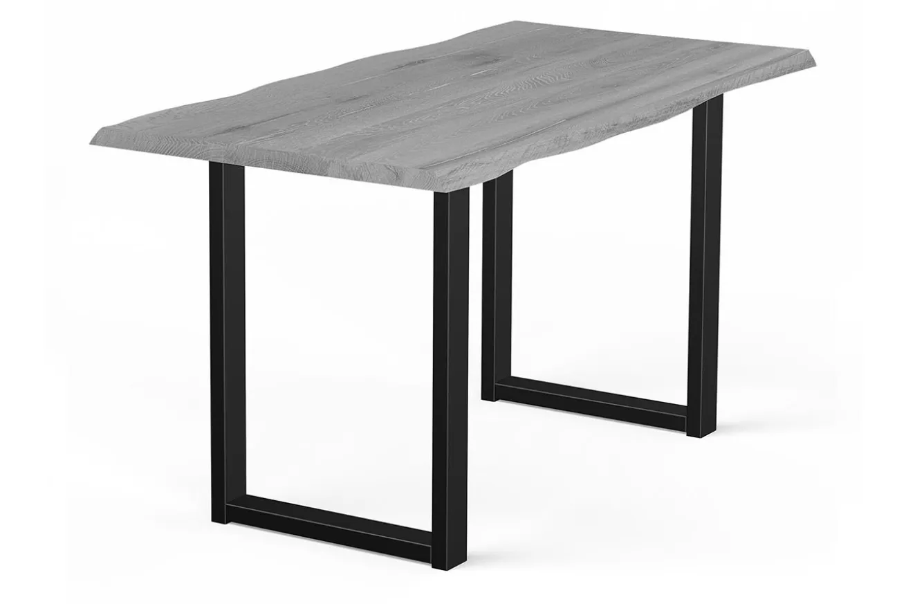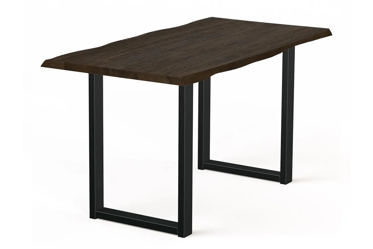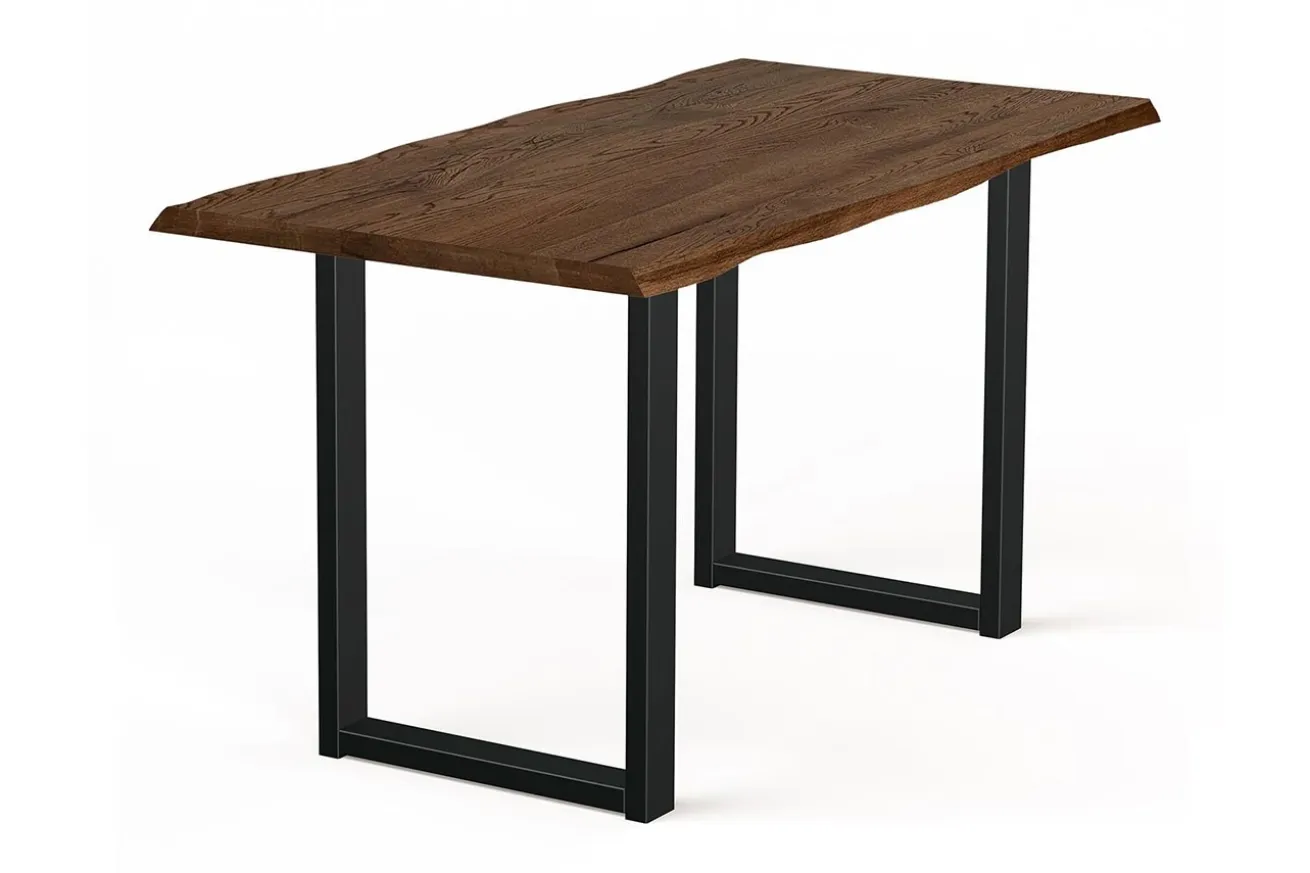 Die zwei U-förmigen Metallfüße in elegantem Schwarz bieten nicht nur eine stabile Basis, sondern setzen auch einen markanten Kontrast zur warmen Holzplatte. Ihr modernes Design verleiht dem Tresentisch eine zeitgemäße Note und harmoniert perfekt mit dem rustikalen Charakter des Eichenholzes.