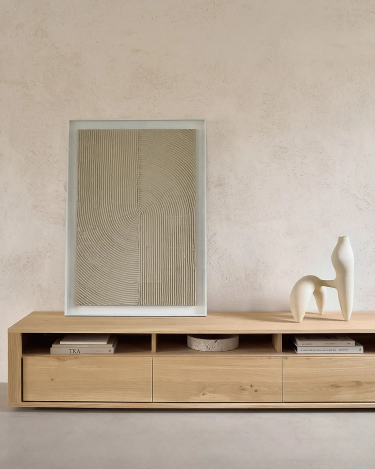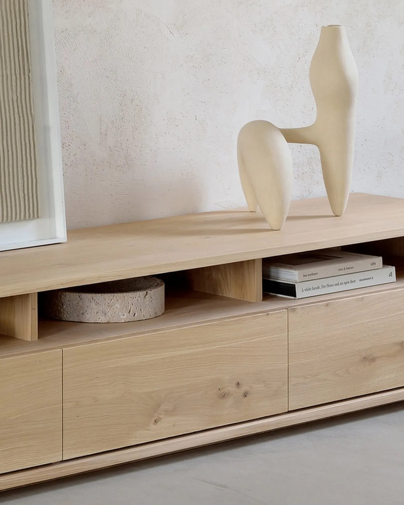 Zeitgemäß, aber dennoch zeitlos schön ist diese komplette Kollektion von Ethnicraft. Diese TV Anrichte besteht aus dem sehr harten Eichenholz und besticht durch seine Naturfarbe. Die Oberfläche wurde geölt. Die tiefe Kommode besteht aus drei Schubladen, in welche Sie genug Dekoration wie Kissen, Decken und Tischläufer verstauen können. Aber auch DVDs, CDs oder Bücher, die nur im Weg liegen. Diese Kommode hat drei kleinere Zwischenräume, in die Sie Receiver, DVD Player oder aber auch die Playstation räumen können. Je nachdem, welche eletronischen Geräte im Wohnzimmer benötigt werden. Das Möbelstück hat eine gleichmäßige Maserung und passt in moderne Milieus.