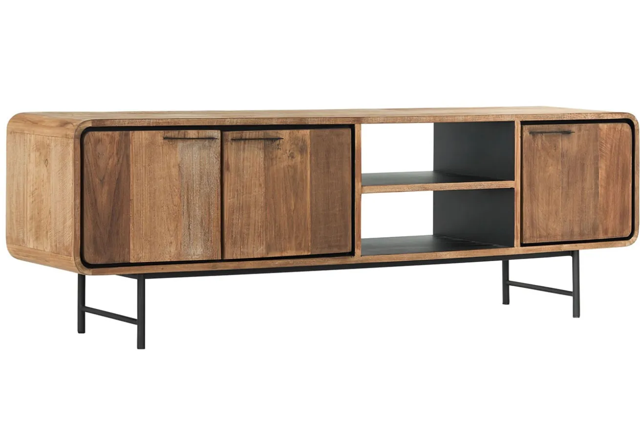 Mit seinen drei Türen und der unterteilten Ablagefläche in der Mitte bietet dieses TV-Board nicht nur ausreichend Platz für Ihre Unterhaltungselektronik, sondern auch praktischen Stauraum für DVDs, Spiele und mehr. Die natürliche Farbe des recycelten Teakholzes verleiht dem Board einen rustikalen Charakter, während die schlanken schwarzen Metallfüße ihm einen modernen Touch verleihen.