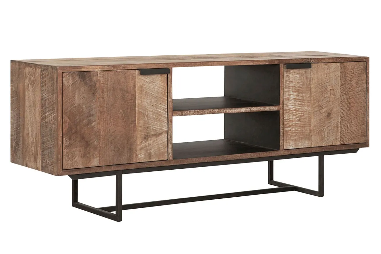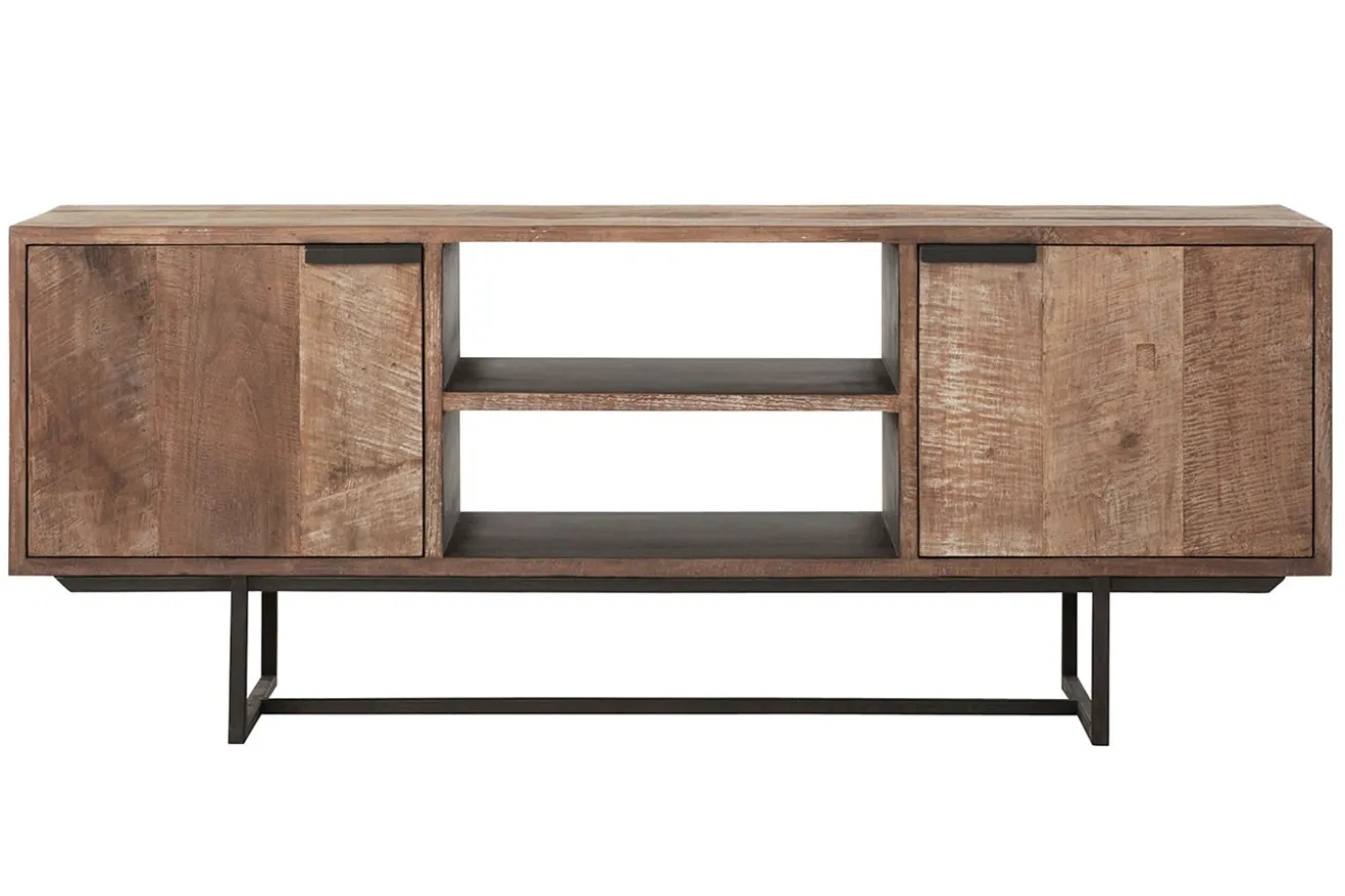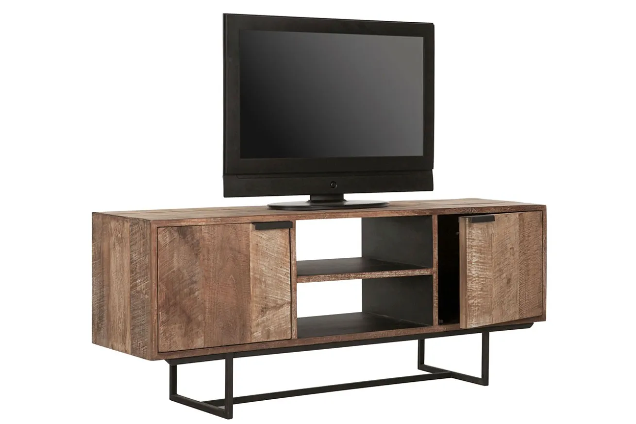Das filigrane Metallgestell in Schwarz verleiht dem TV-Board nicht nur eine moderne Note, sondern sorgt auch für Stabilität und Standfestigkeit. Die klare Linienführung des Gestells harmoniert perfekt mit der organischen Struktur des Teakholzes und schafft einen reizvollen Kontrast zwischen Alt und Neu.