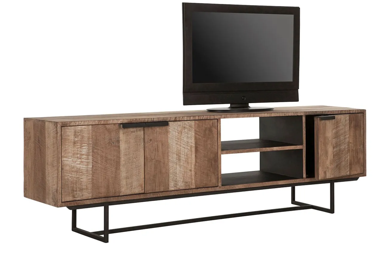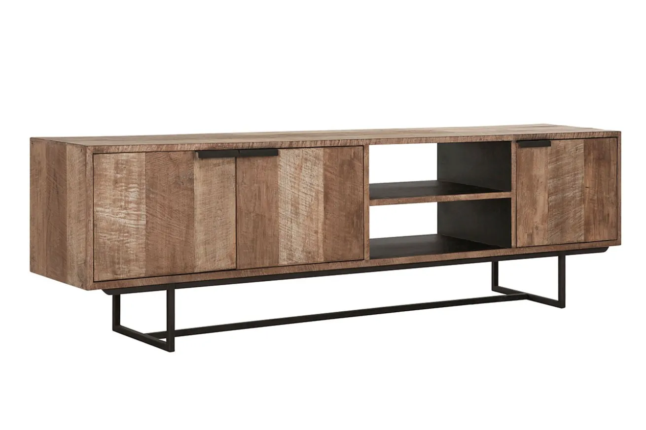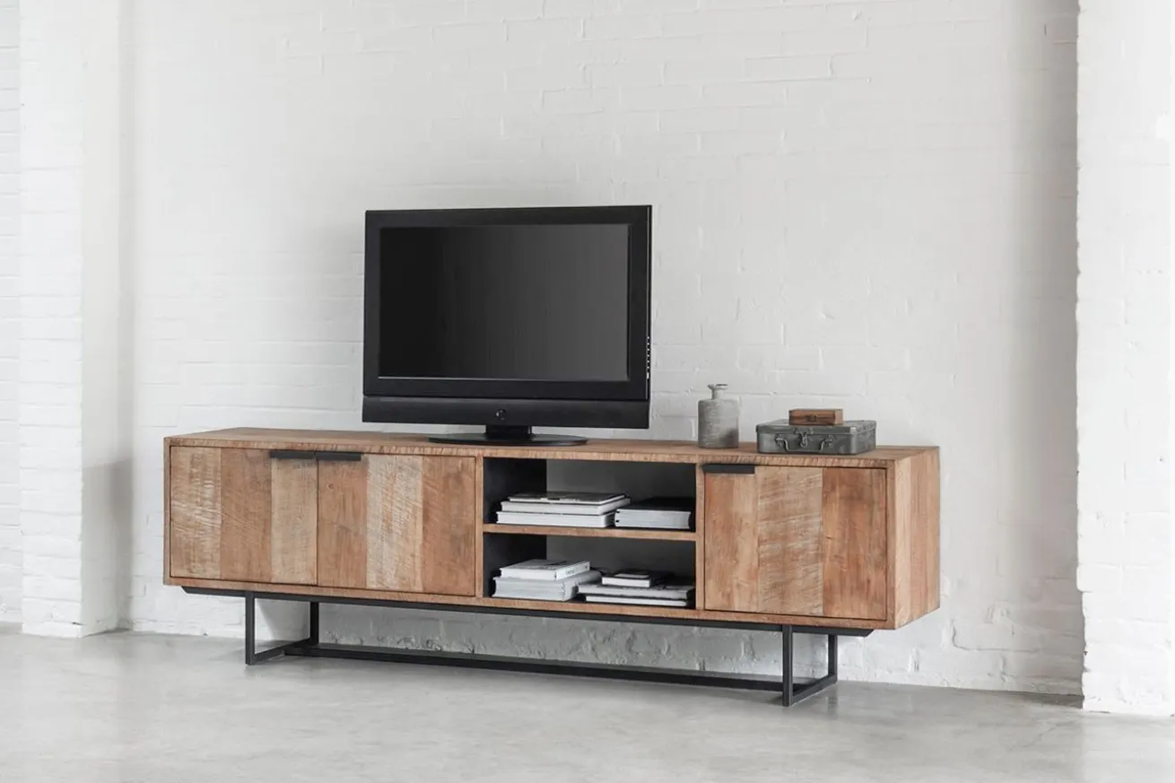 Das filigrane schwarze Metallgestell verleiht dem TV-Board nicht nur eine moderne Note, sondern sorgt auch für Stabilität und Standfestigkeit. Die schlanke Silhouette des Gestells harmoniert perfekt mit der rustikalen Erscheinung des recycelten Teakholzes und schafft einen reizvollen Kontrast zwischen Alt und Neu.