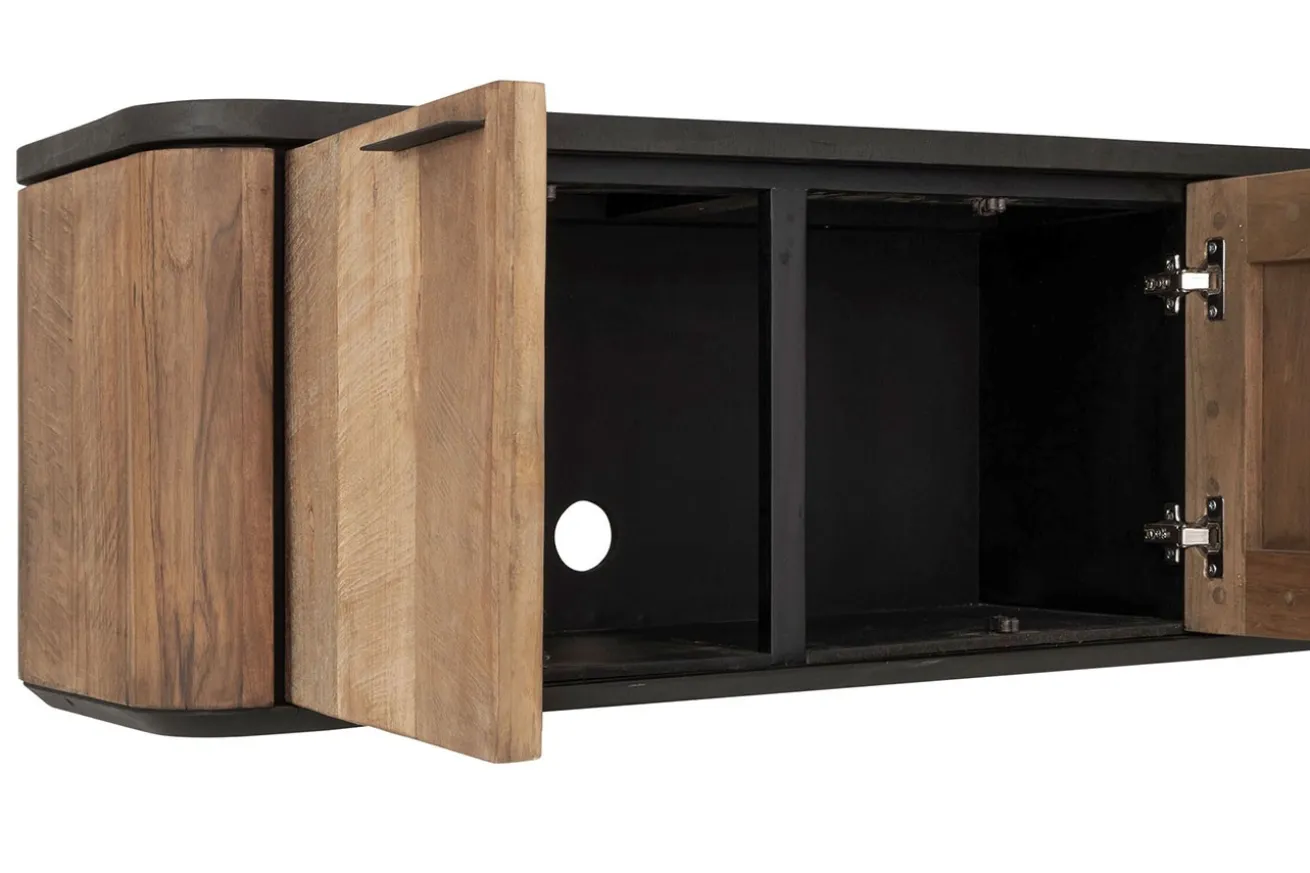 Der Korpus des TV-Boards besteht aus recyceltem Teakholz, das nicht nur umweltfreundlich ist, sondern auch eine einzigartige und charaktervolle Maserung aufweist. Die beiden Türen und zwei Schubladen bieten ausreichend Stauraum für Ihre Multimedia-Geräte, DVDs, Fernbedienungen und andere Wohnaccessoires, während sie gleichzeitig Ordnung und Übersichtlichkeit in Ihrem Wohnbereich schaffen.