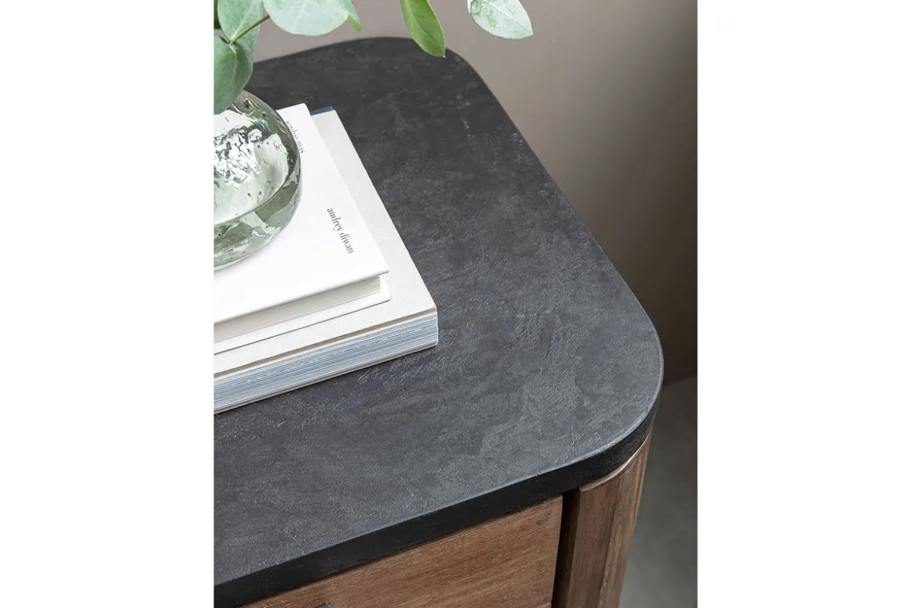 Die oberen und unteren Sims des TV-Boards sind aus Mortex in elegantem Schwarz gefertigt, was ihm einen modernen und industriellen Touch verleiht. Diese Kontraste zwischen dem warmen Teakholz und dem kühlen Schwarz des Mortex schaffen eine faszinierende visuelle Dynamik und machen das TV-Board zu einem Blickfang in Ihrem Wohnzimmer.