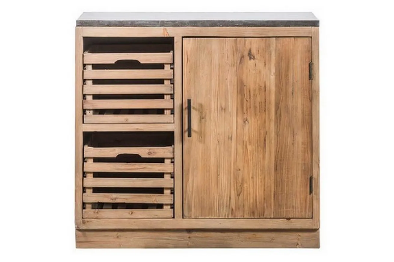 Holen Sie sich den Charme des Landhaus-Stils mit dem Luxus eines modernen Möbels auf die überdachte Terrasse oder in die Wohnung! Der 1-türige Unterschrank Nimes aus leicht grau pigmentiertem recycletem Kiefernholz macht´s möglich. Eine schwere massive Steinplatte in dunklen graubraunen Farbtönen sorgt bei Ihren Freunden für Aufsehen. In dem unteren Teil ist dieses Küchenmöbel mit 1 Tür und 2 Holzkisten ausgestattet, wo Sie zum Beispiel Ihre Kartoffeln, Zwiebeln usw. unterbringen können. (nicht Winterfest, im Aussenbereich wird das Holz stärker Arbeiten, als im Innenbereich. Es können Spannungsrisse auftreten. Schubladen und Türen sollten in regelmäßigen Abständen überprüft und eingestellt werden)