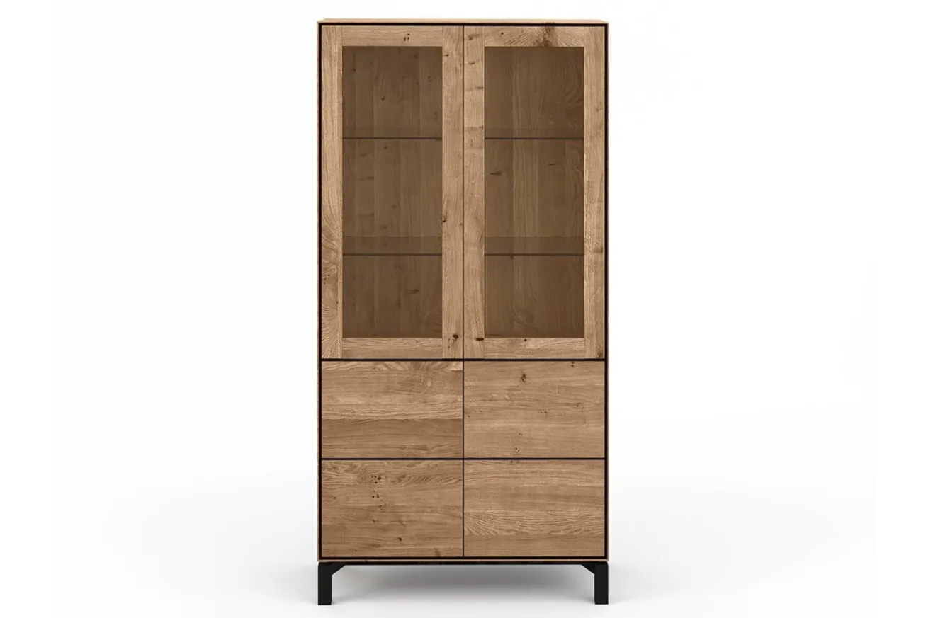 Die warme Ausstrahlung der Wildeiche verleiht dem Schrank eine gemütliche Atmosphäre, während die lackierte Oberfläche das Holz schützt und seine natürliche Schönheit betont. Mit vier Schranktüren, davon zwei oben mit elegantem Glas versehen, bietet dieser Vitrinenschrank nicht nur großzügigen Stauraum, sondern auch die Möglichkeit, Ihre wertvollen Sammlerstücke und Dekorationsgegenstände stilvoll zu präsentieren.