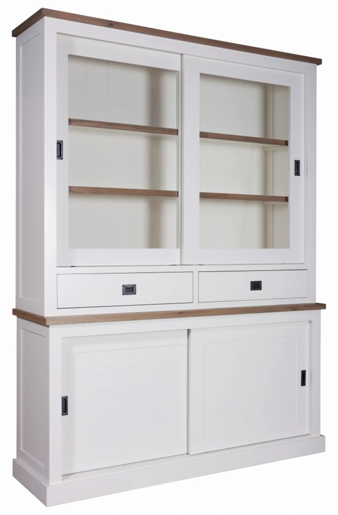 Rustikalität und Landhausstil ist das, was Kubic durch und durch ausstrahlt. Der 220cm hohe und 165cm breite Schrank wirkt harmonisch und passt perfekt in Ihre vier Wände. Er besteht aus weiß lackierter Eiche in Form von MDF Platten. In Kombination mit der Holzart Kiefer, die als Vollholz im Naturton als Einlegeböden und Deckel im Kontrast stehen, wird das Produkt zu einem Möbelstück mit natürlicher Eleganz. Vier Schiebetüren, zwei ohne, zwei mit Glas, lassen teilweise in das Innenleben der Standvitrine blicken. Die beiden Schubladen dazwischen sorgen für Stauraum für kleine Gegenstände. Dunkelgraue Griffe zeigen, ohne sofort hervorzustechen, wo Sie die Türen schieben können. Ein Möbelstück, das mit all seinen Fasern ‚Landhaus‘ ruft!
