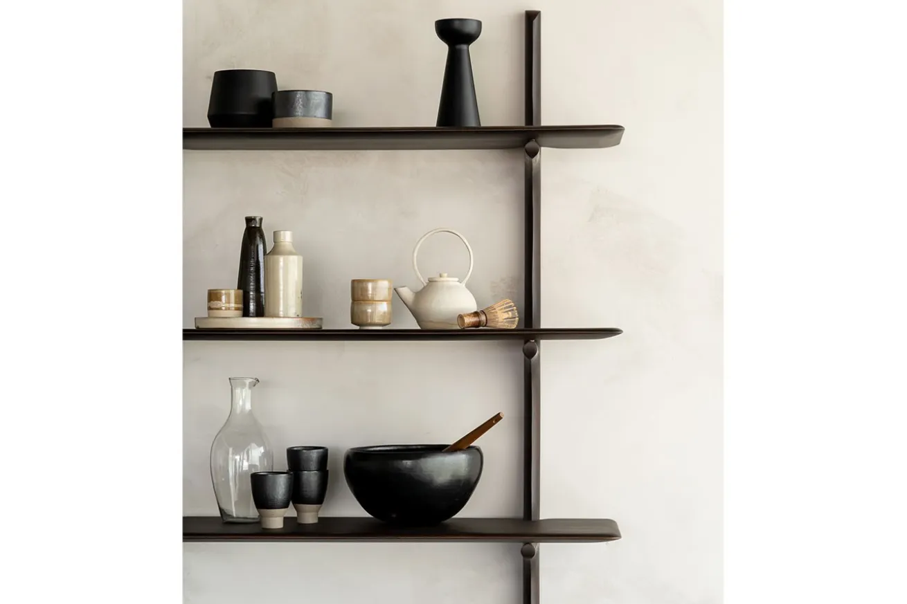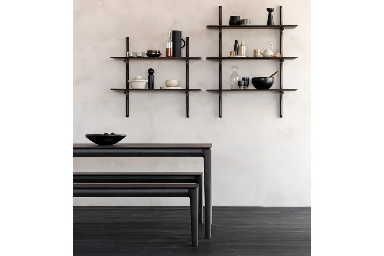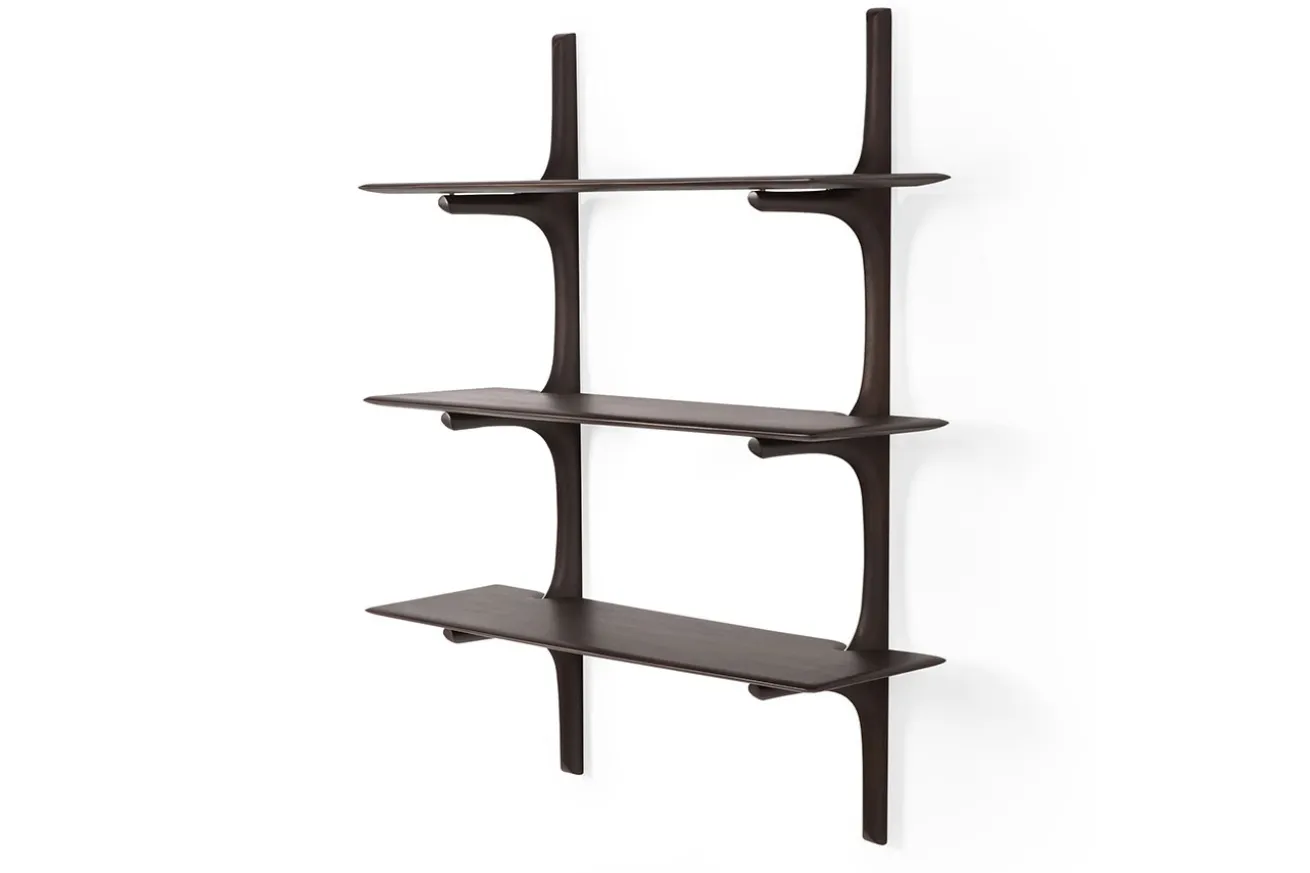 Die PI-Kollektion ehrt das Design der Natur, indem sie ihre organischen Formen und Linien bewahrt. Das Wandregal aus dunkelbraun gefärbtem Mahagoni-Holz präsentiert sich mit drei übereinander angeordneten Böden, die sanft geschwungen aus der Wandhalterung herauswachsen. Jedes Exemplar wird von Hand veredelt – so entsteht ein einzigartiges Finish, das die natürliche Struktur des Holzes sichtbar macht. Das Regal kombiniert skandinavische Leichtigkeit mit skulpturaler Präsenz und bietet eine stilvolle Bühne für Bücher, Objekte oder Erinnerungsstücke.
