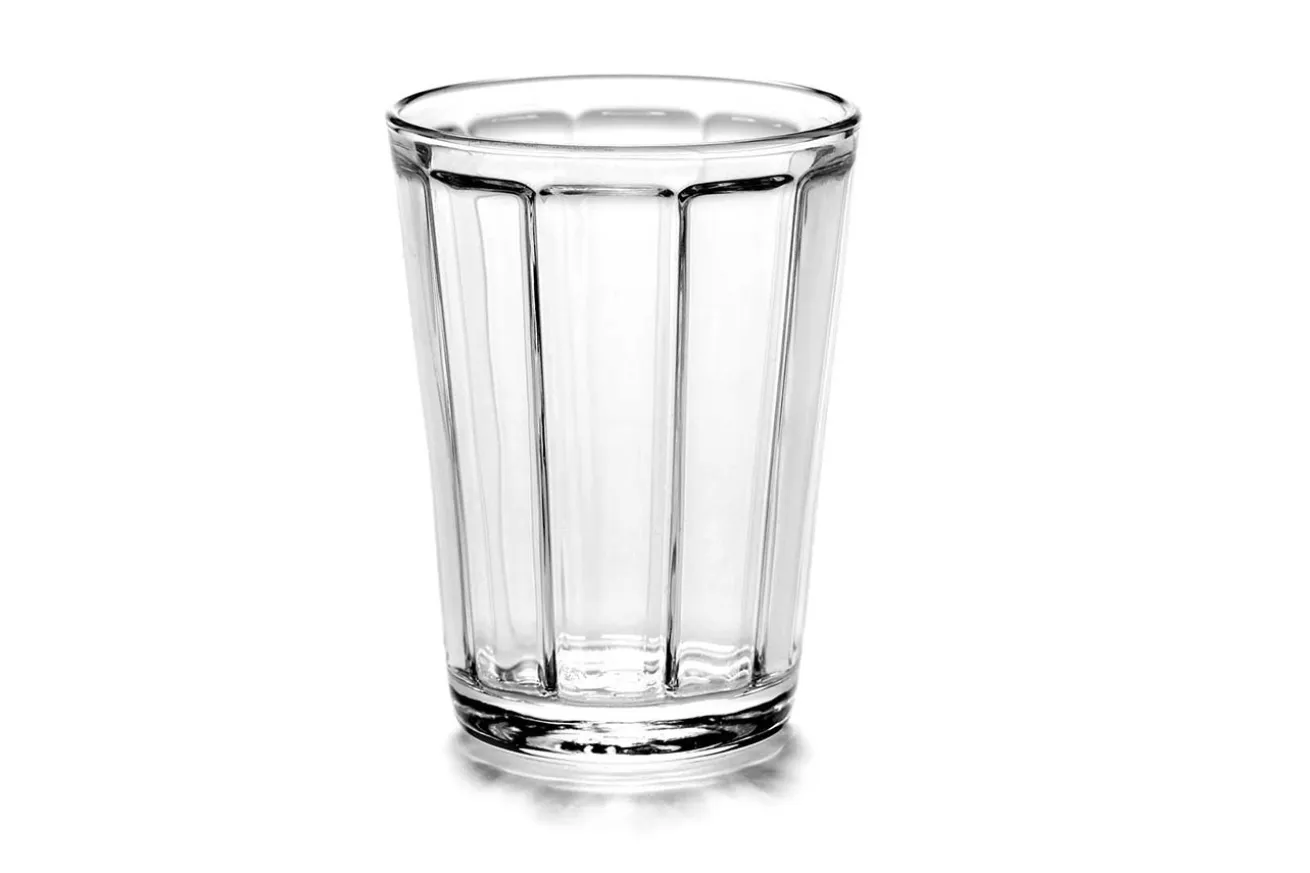Das Außergewöhnlich bei diesem Glas ist, dass die Außenseite glatt ist, während sich die Strukturierung auf der Innenseite befindet. Der Designer Sergio Herman hat dies mit Absicht getan, um eine optische Täuschung hervorzurufen und das eigentlich schlichte Glas zum Trinken zu etwas Besonderem zu machen. Das mediumgroße Glas hat einen Durchmesser von 7cm sowie eine Höhe von 9,5cm. Weder zu groß noch zu klein, um damit die alten Trinkgläser zu ersetzen.